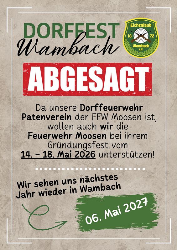 | 14. bis 18. Mai | Gründungsfest der FFW Moosen |